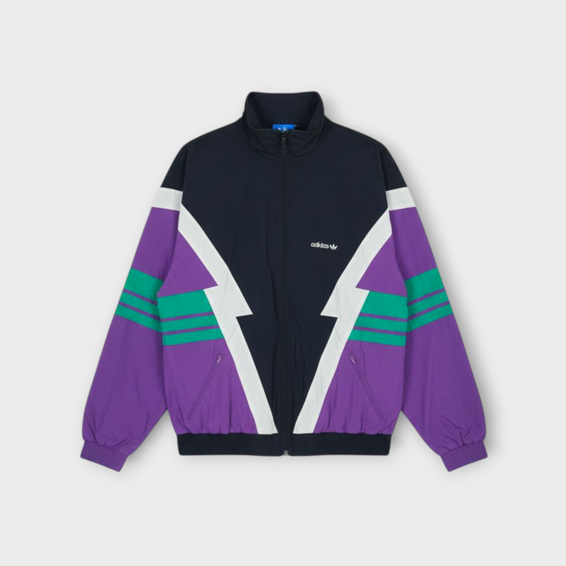 Original Adidas Originals 1990s tracksuit featuring a striking lightning-inspired panel design in black, purple, green, and white.