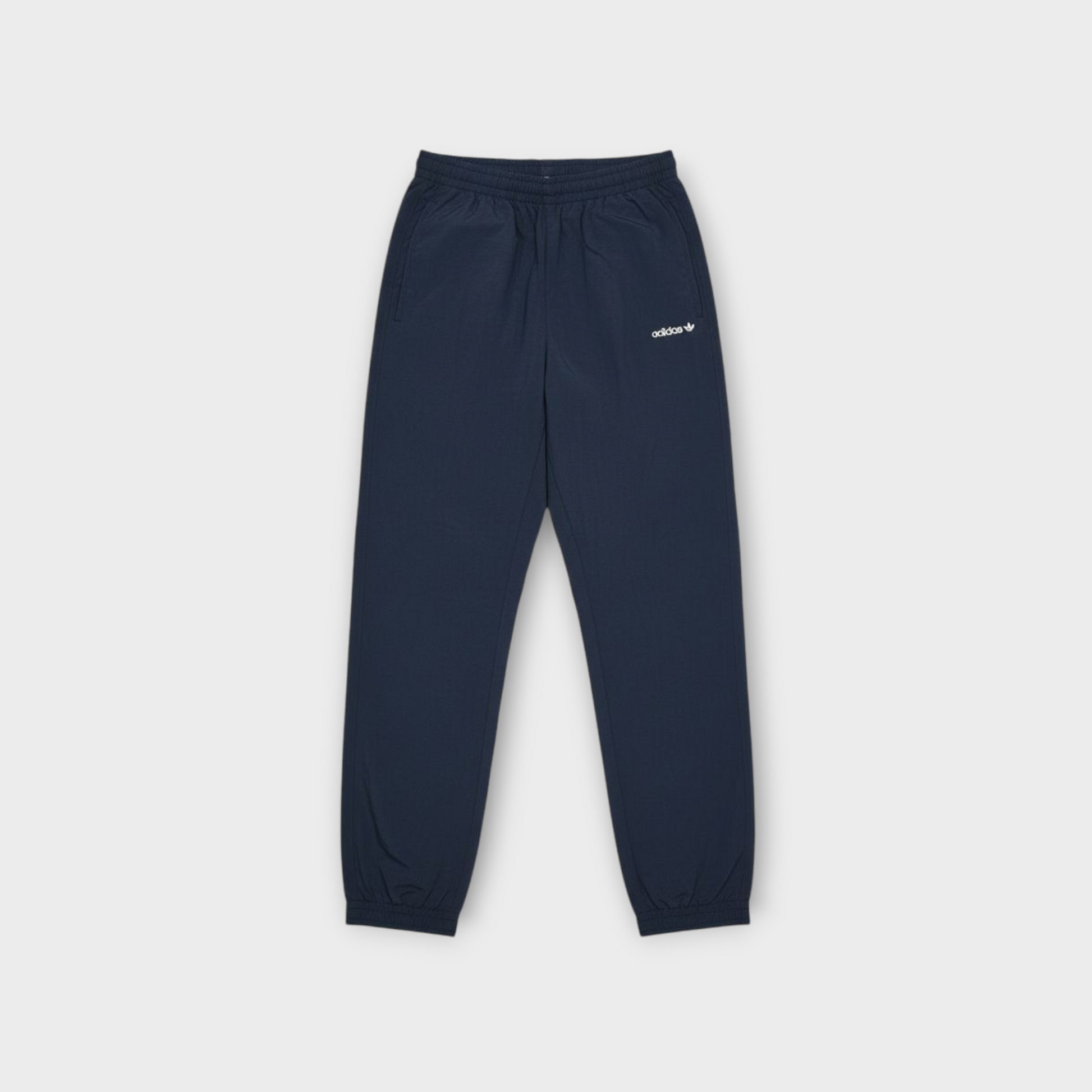 The jacket showcases a bold asymmetrical V and stripe geometry with embroidered Trefoil logo on chest, paired with matching navy/black track pants with side logo detail.