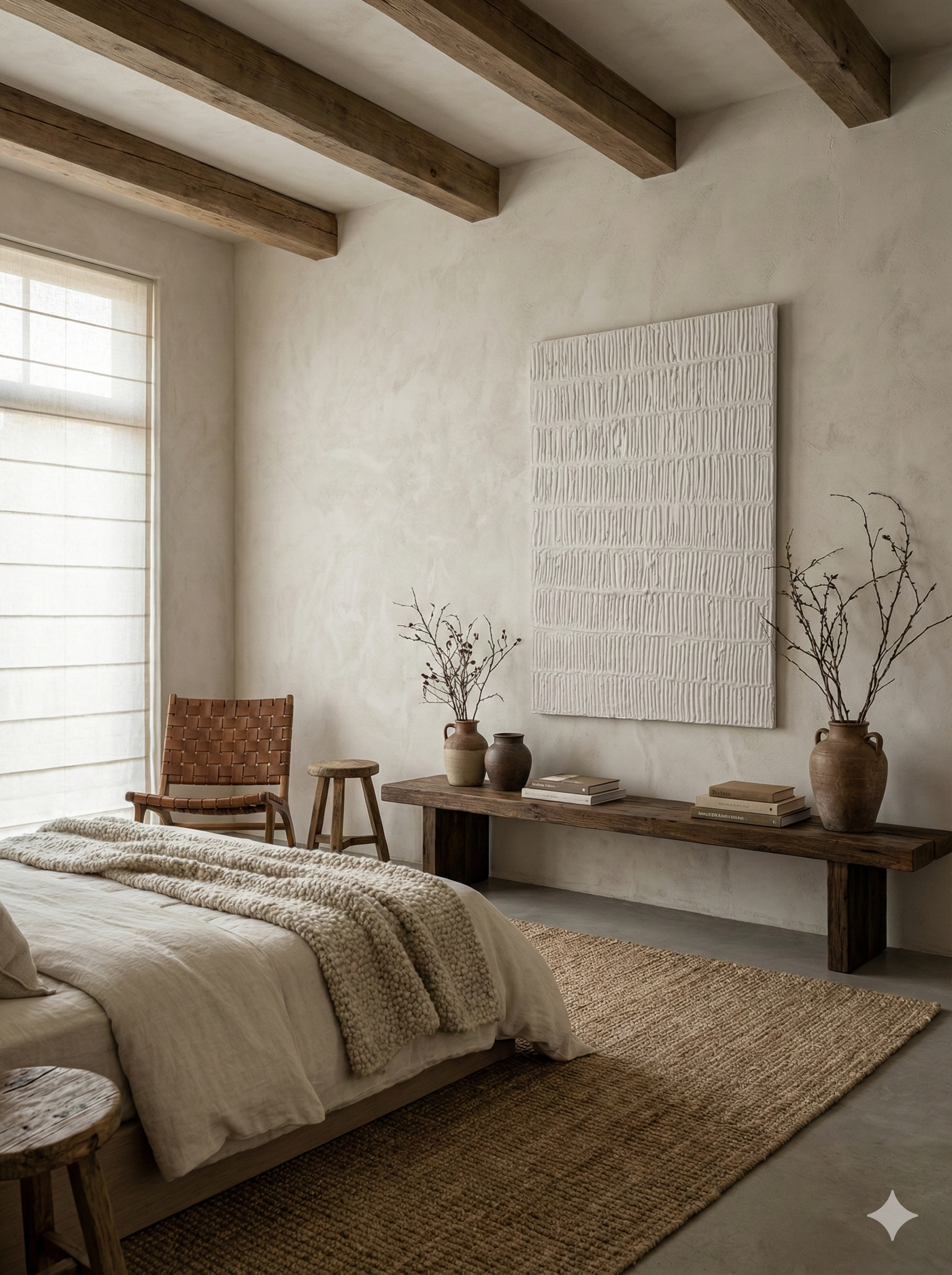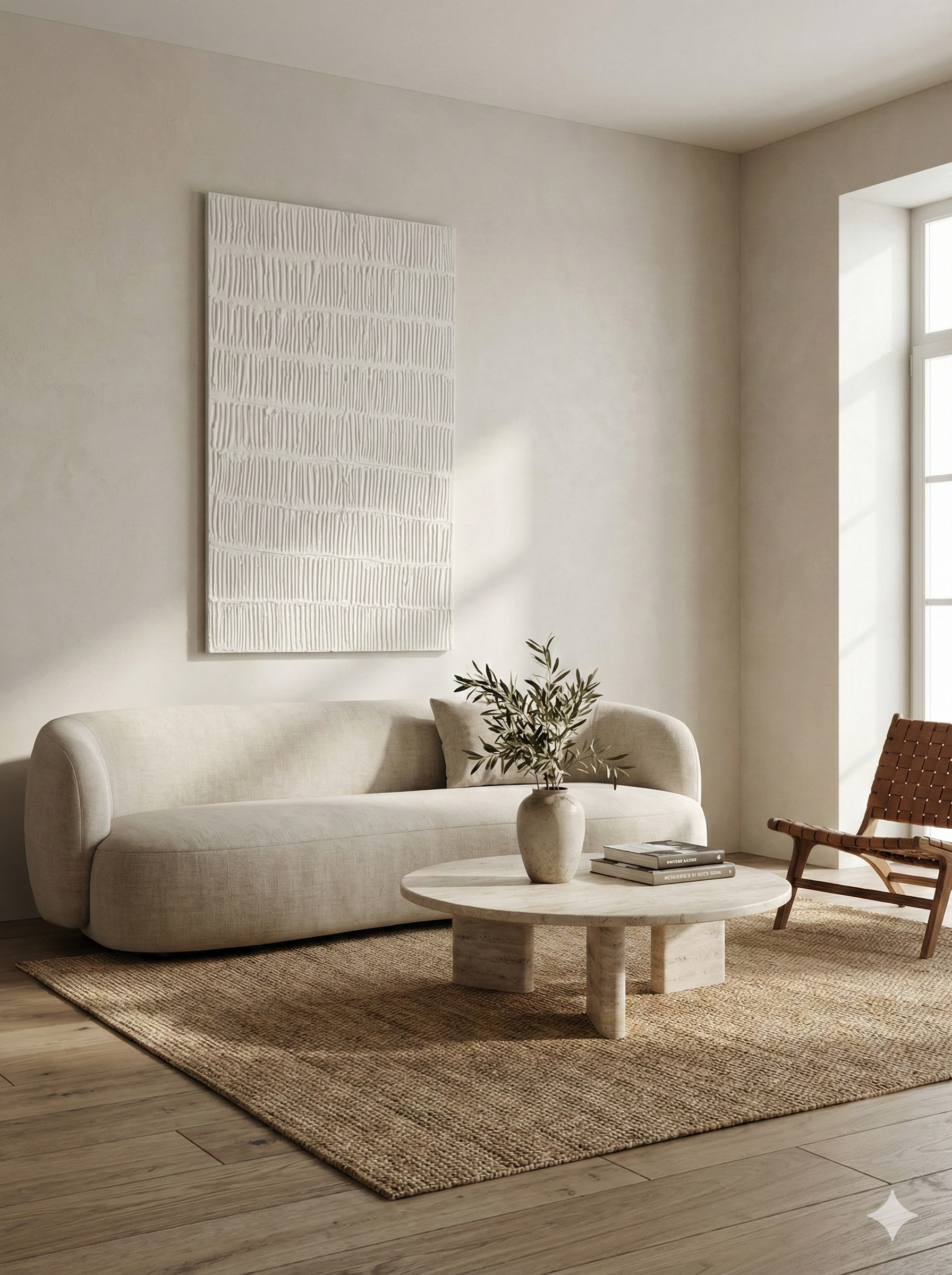 La textura crea profundidad y calma visual, integrándose de forma natural en interiores luminosos y neutros.